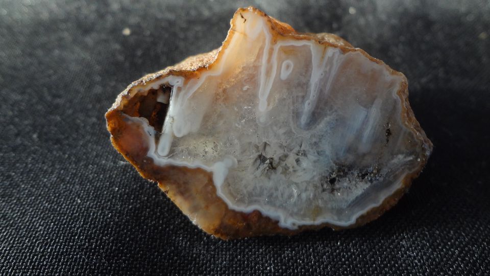 Tato ukázka je středně velká pecka s bílým achátem, křišťálem a mechem – zajímavá ukázka