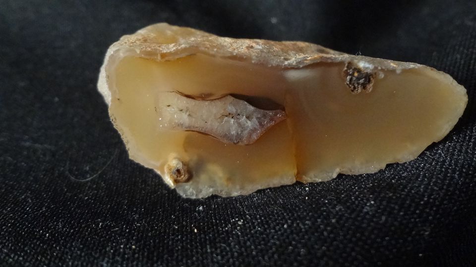 Tato ukázka je menší pecka s do žluta zbarveným chalcedonem a křemenem